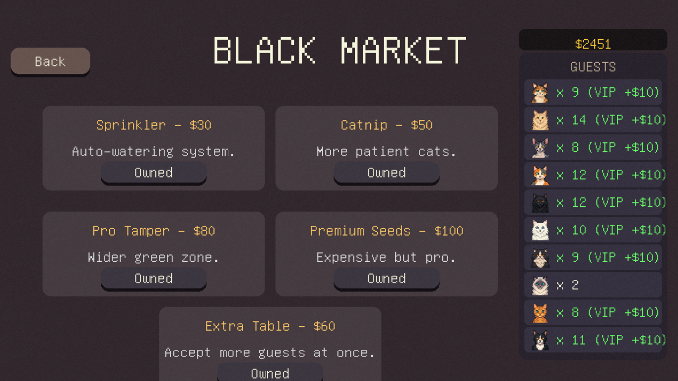 This is an early Alpha build, and I'm pouring my heart into it! Right now, you can play through the first 30 Days of the shop's life: